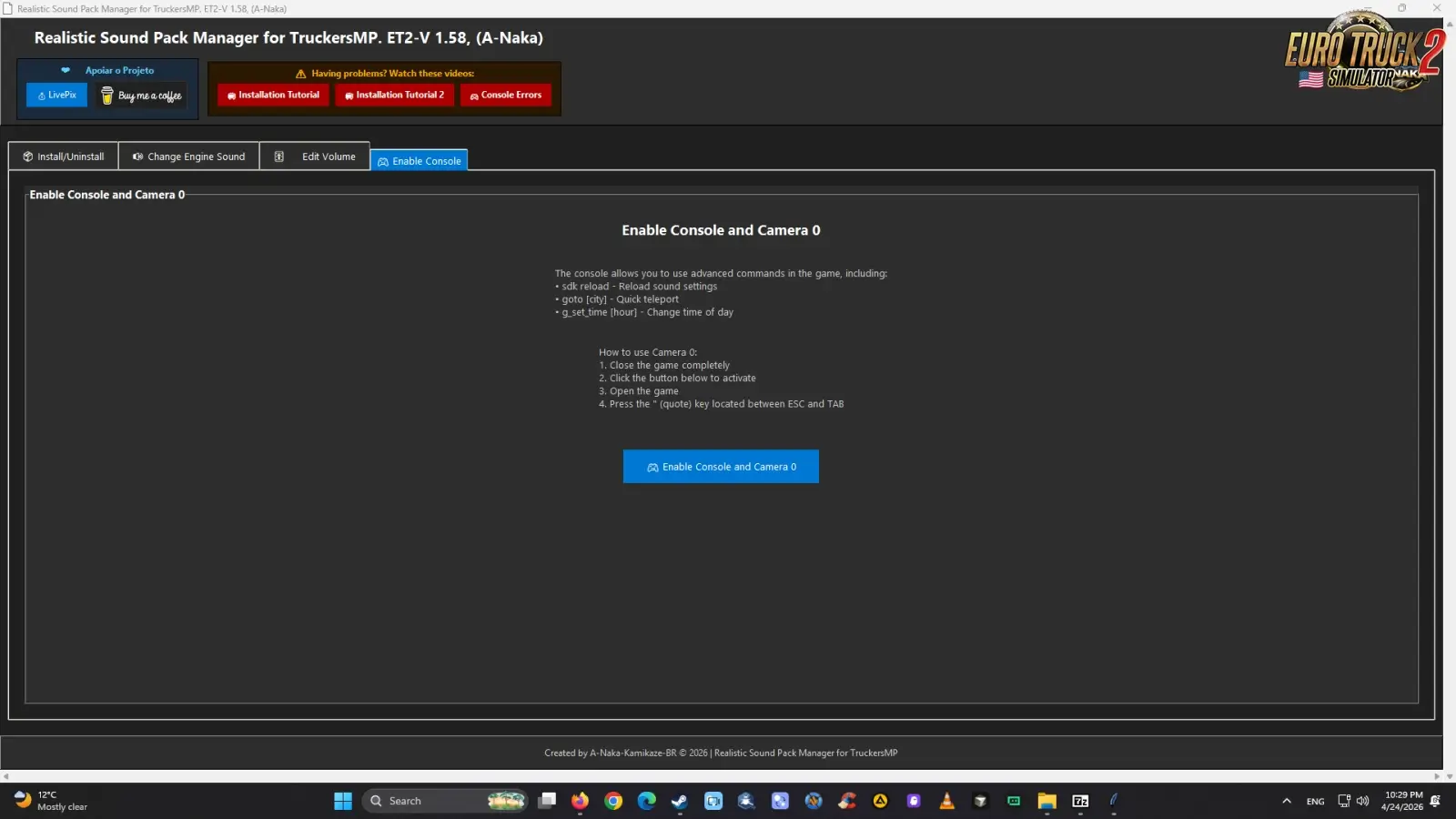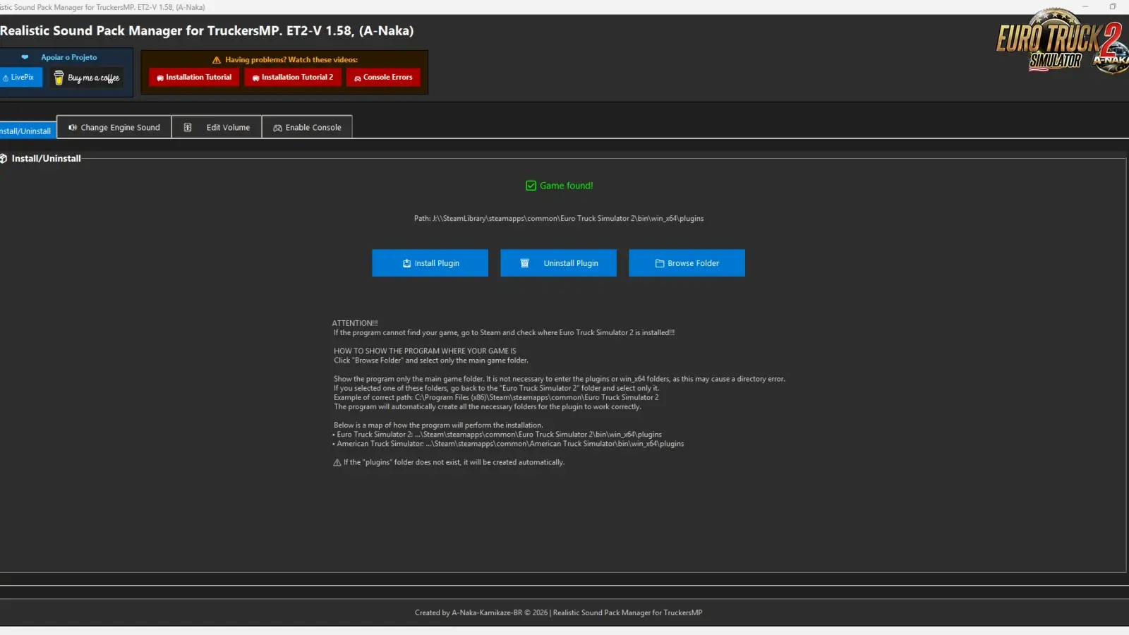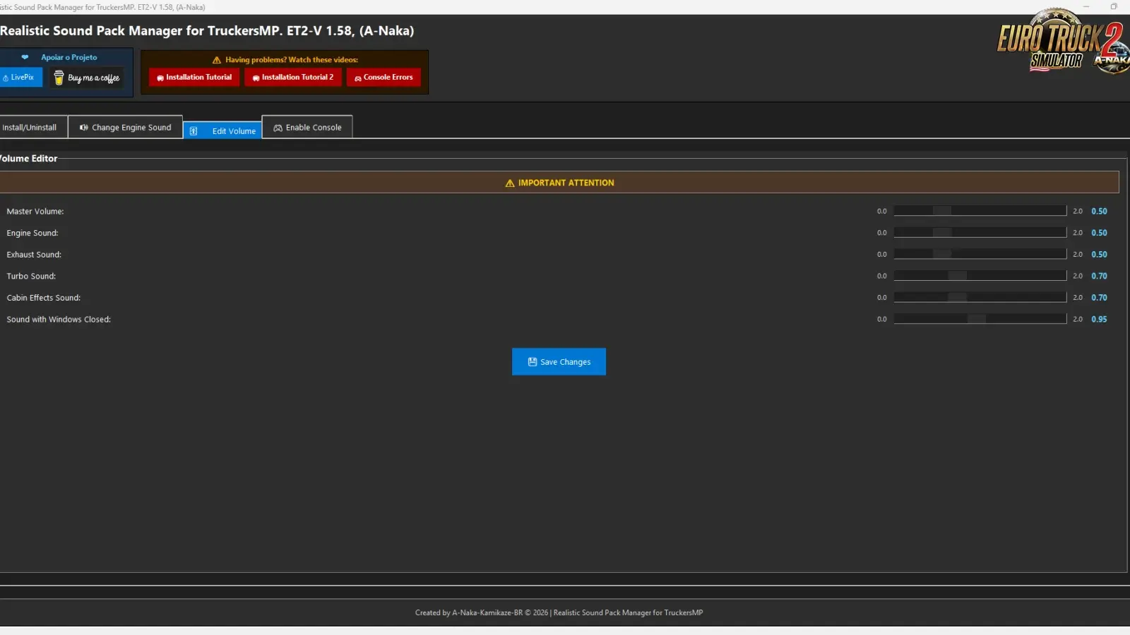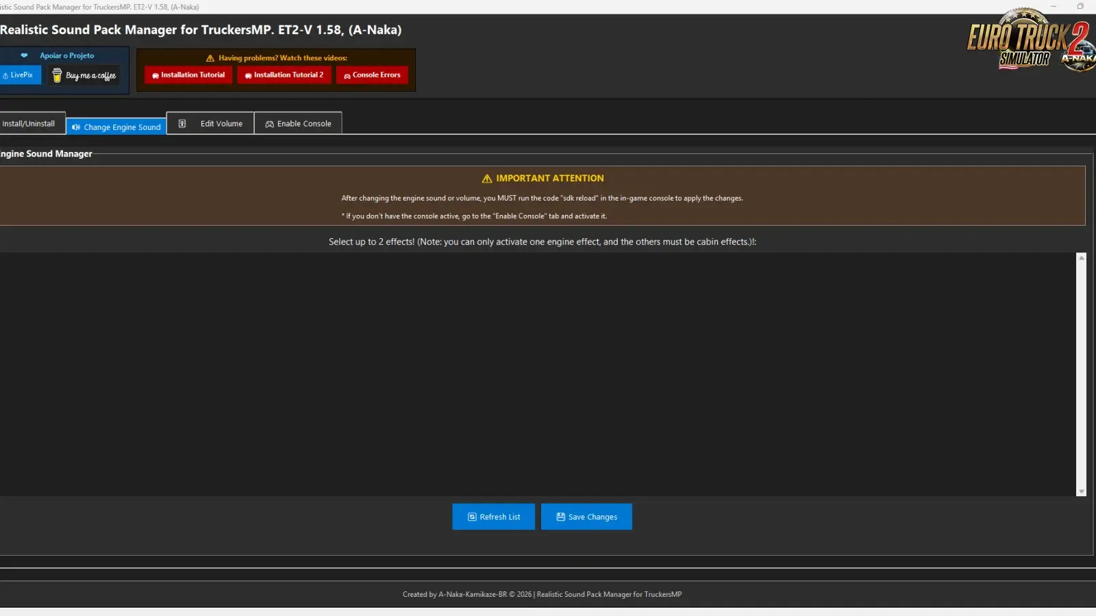 ๐ง Realistic Sound Pack Manager by A-Naka for ETS2 - this mod brings an easy-to-use sound management tool to ETS2 players as a standalone utility program, perfect for quickly installing and managing realistic engine sound packs with just one click, especially optimized for TruckersMP multiplayer while improving overall audio immersion on European routes.