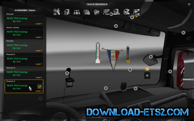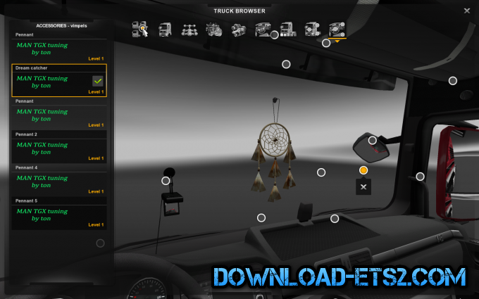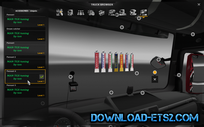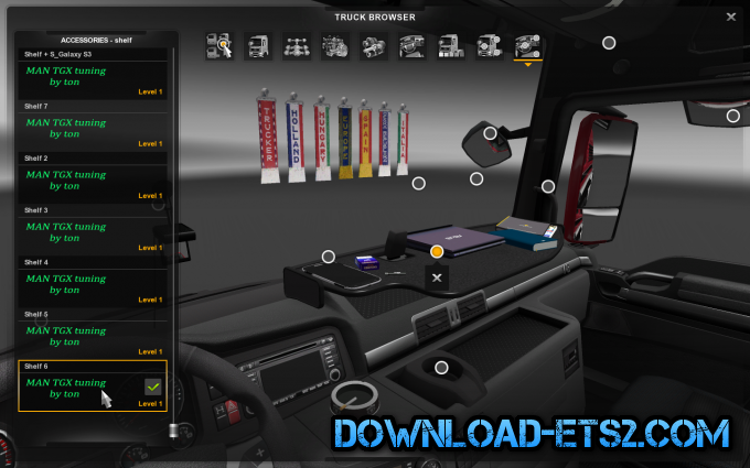 This pack contains a lot of new tuning parts for both exterior and interior of the MAN TGX.