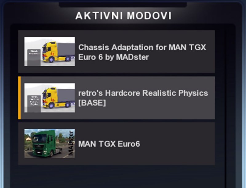 | Hardcore Realistic Physics v2.1 by retro for Euro Truck Simulator 2 game. This is a hardcore realistic physics mod designed for users who are looking for a realism. Also, the mod changes interior camera behavior. New Changelog v2.1: -Fixed bugs from the previous version -Improved rear and front axle damping -Significant improvement regarding cabin side to side movement -The mod now contains 32 adapted chassis files for: DAF XF 95 by danyterminator and Alexander Sertakov DAF XF 105 by vad&k Mitsubishi Fuso Super Great by Koutsu dorobuta RecycleDog and Inonaka Iveco Stralis AS2 by Vervoort MAN TGA by MADster MAN TGS by MADster MAN TGS Euro 6 by MADster MAN TGX by MADster MAN TGX Euro 6 by MADster MB Actros MP3 Reworks by MrCapital MB Antos 2012 by D3S Design Mercedes Actros MP1 by ValheinXL Mercedes Actros MP2 by ValheinXL Renault Magnum Updates by knox_xss Renault Range T 480 Euro 6 by Polatli Mods Team Scania P & G Series by Wolfi & Nazgûl updated by Sogard3 Scania R & Streamline Modifications by RJL Scania 4 series addon for RJL Scanias by RJL Sisu Polar Mk1 by MrCapital SISU R500 C500 and C600 by RJL Volvo FH&FH16 2012 Reworked by Eugene Renault Premium Reworked by Schumi Mercedes Actros MP4 Reworked by Schumi Mercedes Actros MP3 Reworked by Schumi Iveco Hi-Way Reworked by Schumi Daf XF Euro 6 Reworked by Schumi DAF XF 105 Reworked by Schumi FAW J6P Truck by 尛财迷 Renault Premium dCi by CyrusTheVirus Renault Integral by CyrusTheVirus Renault AE Magnum by CyrusTheVirus If a truck mod that you use is not on the list follow the tutorial below. In the meantime let me know which truck you want to be adapted and I'll make an adaptation. So, how to do it? For example I want to adapt MADster's MAN TGX Euro 6... You open the truck mod and follow this path: man_tgx_euro6_byMADster_v2.1.scs\def\vehicle\truck\man.tgx_euro6\chassis\4x2.sii You open this .sii file and change default values to these residual_travel[]: 0.30 # 1st axle residual_travel[]: 0.10 # 2nd axle kerb_weight[0]: 5000.1 kerb_weight[1]: 2000.1 For now, the mod is only suitable for 4x2 chassis. In one of the next updates I'll make one more additional mod for 4x2 lowdeck chassis, because if you change residual travel of an axle the whole truck behaves differently. Next thing you need to change is trailer stability. Decrease trailer stability all the way to the left, to the minimum. Braking intensity should be at the middle if you use keyboard, but for the steering wheel users I recommend to try it out and see how it feels, how it's more comfortable for you. Physical camera movement factor to the maximum. You are done! That's it! The working principle: In the mod file you have "retro_s_Hardcore_Realistic_Physics_[BASE]" file which already contains chassis for default truck and "Chassis Adaptation" folder in which you have all adapted chassis files for 32 trucks listed above. So, you have to place "retro_s_Hardcore_Realistic_Physics_[BASE]" above a truck mods you use and above it place appropriate chassis files for a truck mods you use. Here's is the example: Go back |